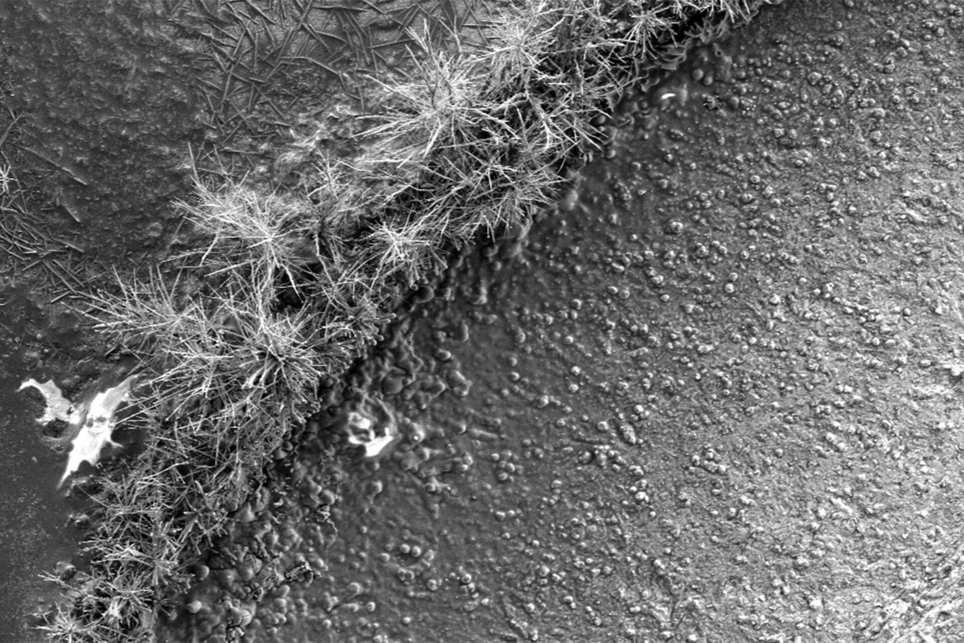 Kristalle oder Nadeln auf der Oberfläche von Bauteilen, Schrauben oder Metallgehäusen. Diese entstehen häufig durch die Ablagerung von Korrosionsprodukten unter bestimmten Umweltbedingungen.