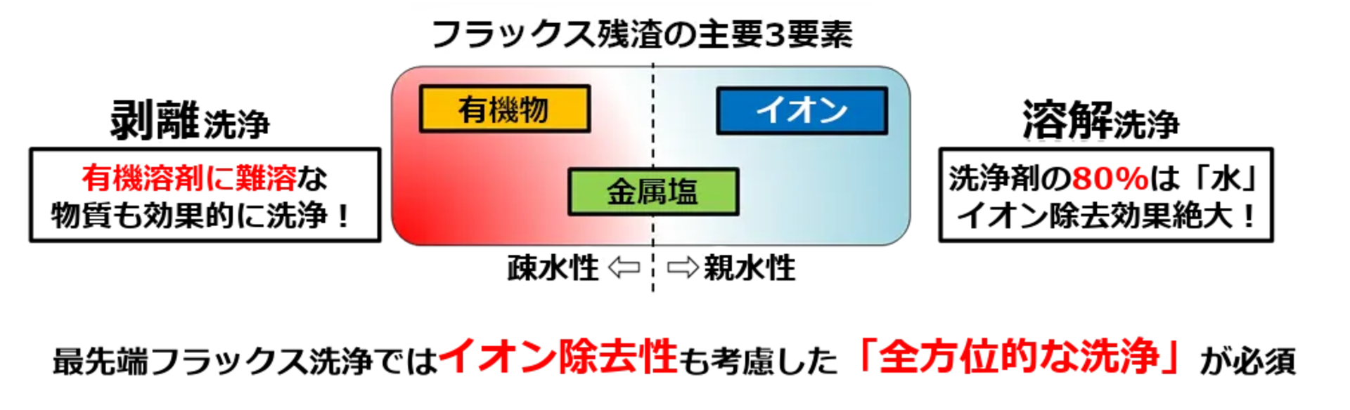 無洗浄はんだを洗浄しようとする際、フラックスそのものだけを取り除くのではなく、先ほど述べた難溶性物質を含んだ複数の成分を同時に除去しなくてはなりません。